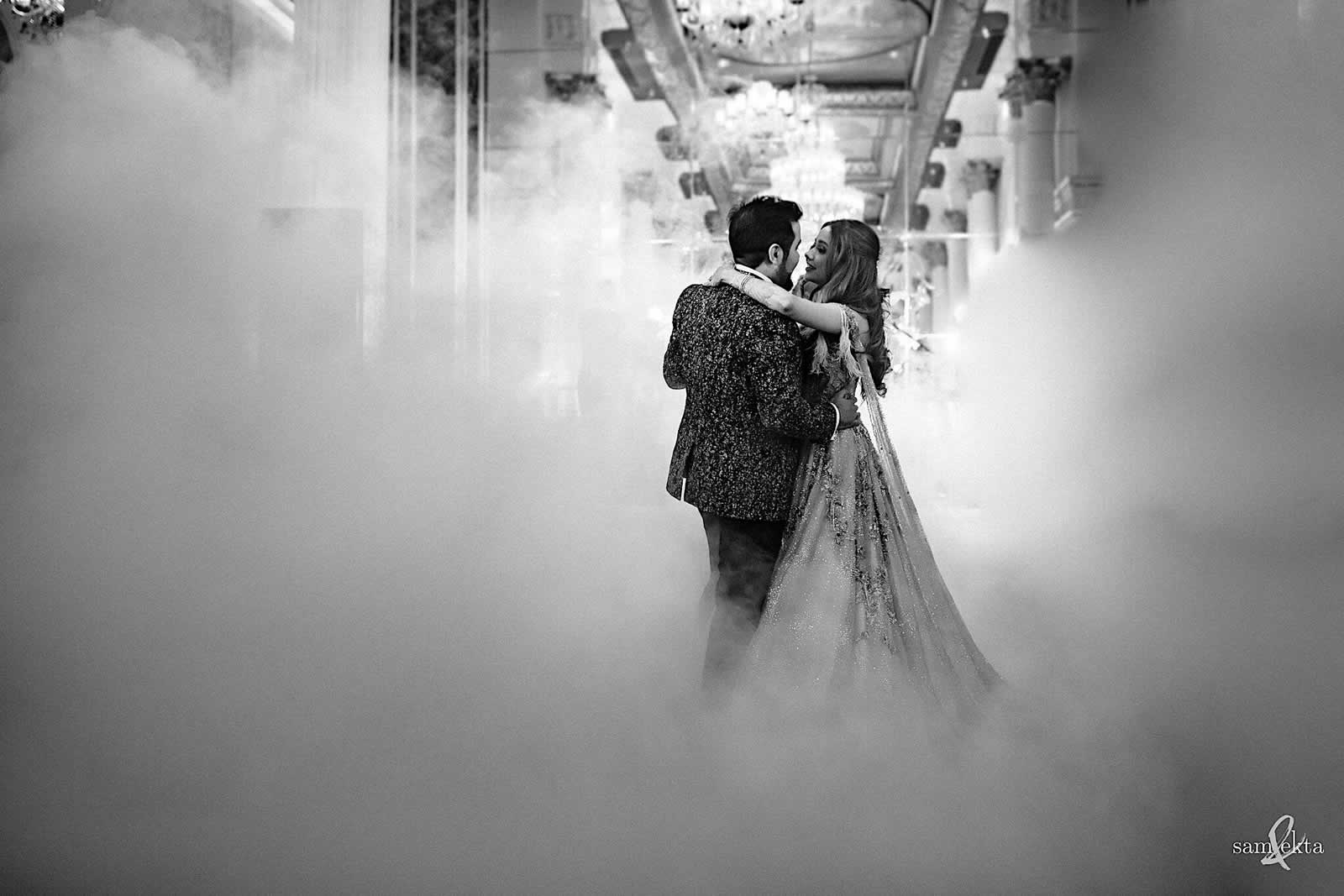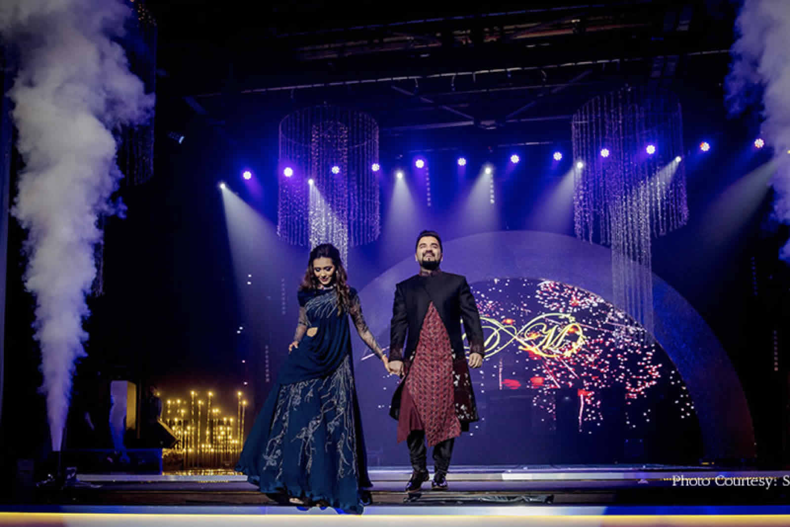 Transitioning to the Sangeet, guests were transported into a world of glamour and enchantment, where aerial artists, water drummers, and flaming shots ignited the night. The theme of ‘Glamor & Crystals’ shimmered throughout the evening, captivating hearts and igniting a sense of wonder.