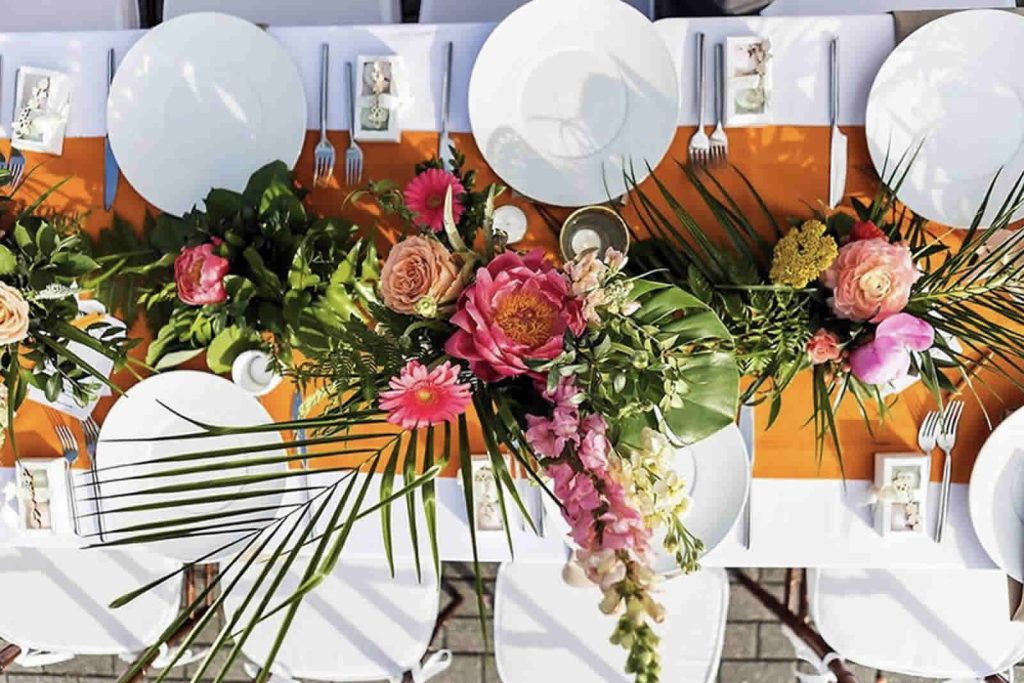 The choice of linen is always the first pick as its sets the base for everything else to flow over it. Depending on the theme, you could choose to go abstract art or classic. Both have their own charm. It is essential to pick carefully to ensure that the tablescapes complement the theme rather than being disruptive. Once the base linen has been picked, everything that sits atop can be customized. From charger plates to candelabras, floral arrangements, name tags, napkins, and a lot more. It is ideal to have a continuous theme throughout the event from tablescapes to entrance décor, stage design and the bar design. This provides the guests an immersive and a wholesome experience.