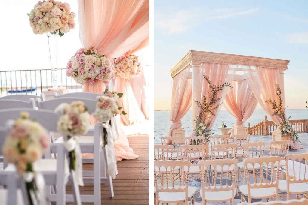 Ceremony Setting: Infuse romance into your ceremony with Peach Fuzz drapery and floral arrangements. Imagine saying your vows against a backdrop of delicate peach-hued blooms intertwined with lush greenery.