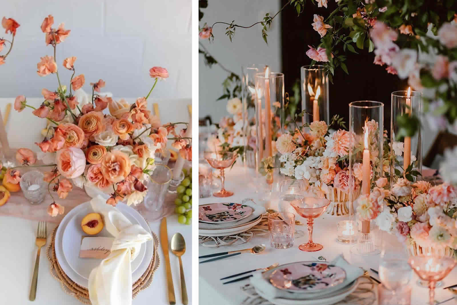 Reception Splendor: Transform your reception into a Peach Fuzz wonderland with tablescapes featuring the color in various elements. From table linens to floral centerpieces, let this charming hue set the stage for an unforgettable dining experience.