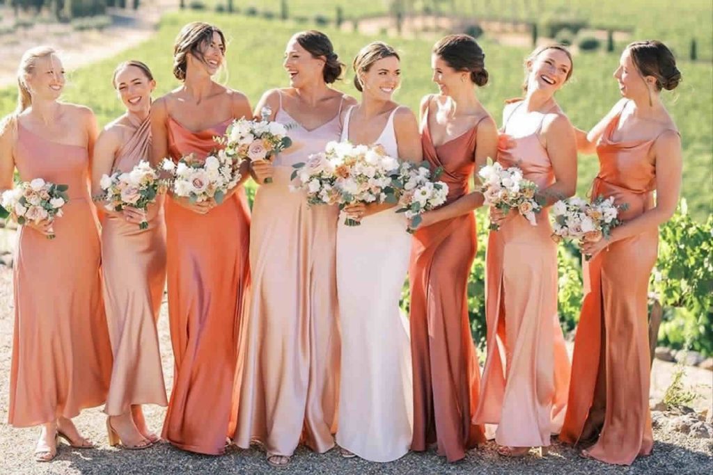 Dress your bridal party in varying shades of Peach Fuzz, allowing each member to showcase their unique style while harmonizing with the chosen color palette.