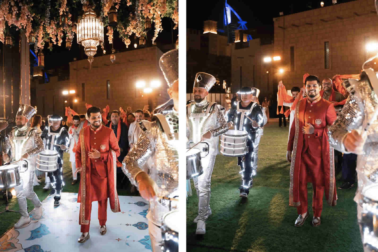 Once all the guests settled in, our Celebrity MCs, Gauhar Khan, and Yasir Hussain announced the commencement of the Royal Baraat procession. Our Groom’s Baraat procession was power-packed, with his entourage dancing their way through a 120-meter-long stretch pathway along the entrance of Asateer. The one-hour-long Baraat saw talent from over the globe with shows, stunts, and different experiences for the guests to enjoy. These dancers led the Baraat as the procession followed. Finally, we could see our Shahenshah enter on his Royal Horse, along with his Kingsmen. Over a 100 performers mesmerised the crowd, and it was definitely a Baraat you wouldn’t want to miss!