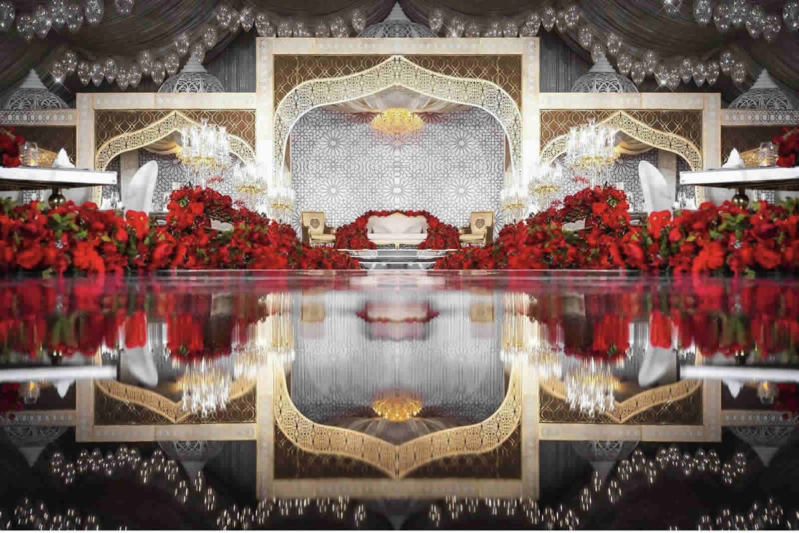 The venue was decked up like none other; one could smell hundreds of fresh roses all around the beautiful arena giving a rich royal feel to the evening. The Decor was inspired by Royal Mughal Palaces with Golds and Reds and a grand stage with handcrafted beautiful water fountains on each side. This event also featured custom-made plush furniture and designer tableware representing the richness of the evening, with some of the finest culinary experiences brought straight to the table like Royalty.