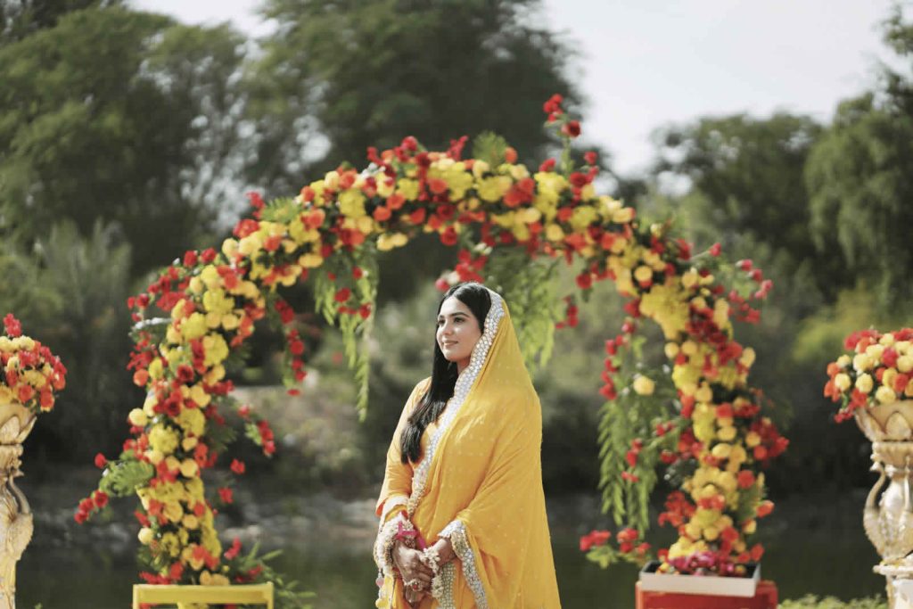 The next morning, the Manjay Ceremony kickstarted the celebrations for the Bide’s side of the family. Hosted at The Mulk Residence at Al Barari, Dubai. This ‘Sheesh Mahal’ morning began as our astonishing Bride walked toward the lavish garden under her beautifully adorned flower chaadar in shades of oranges, yellows, and golds. Sania then proceeded with the Manjay rituals with her close family, where they adorned her with jewelry and showered her with tons of fresh flower petals.