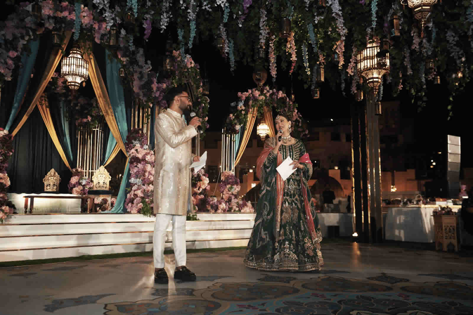 After such a rich experience, the hostesses guided all the guests towards Fort Island, which was embellished with royal furniture with vibrant colors. The evening continued with DJ Gautam playing tunes to set the guests’ mood for the exciting evening ahead. Once all the guests settled in this beautiful venue with lanterns and Moroccan-themed centerpieces, their sight went straight to the stunning Menus and Agenda of the evening crafted by VC Creatives with intricate gold designs on a rich velvet print. We kickstarted the evening by introducing the star celebrity MCs of the Night.
