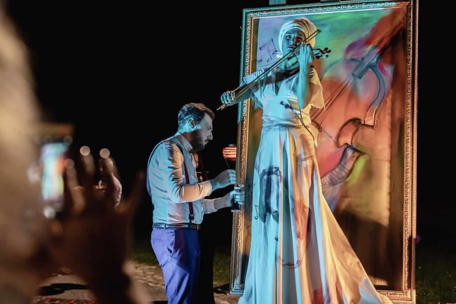Elevate the artistic atmosphere of your wedding by featuring live art performances. Hire talented artists to create captivating works of art during the event, such as a live painter who captures the essence of the celebration on canvas, a skilled calligrapher who beautifully inscribes guests’ names or well wishes, or a professional sand artist who creates intricate and mesmerizing designs. These live art performances will not only entertain your guests but also provide unique keepsakes and conversation starters.