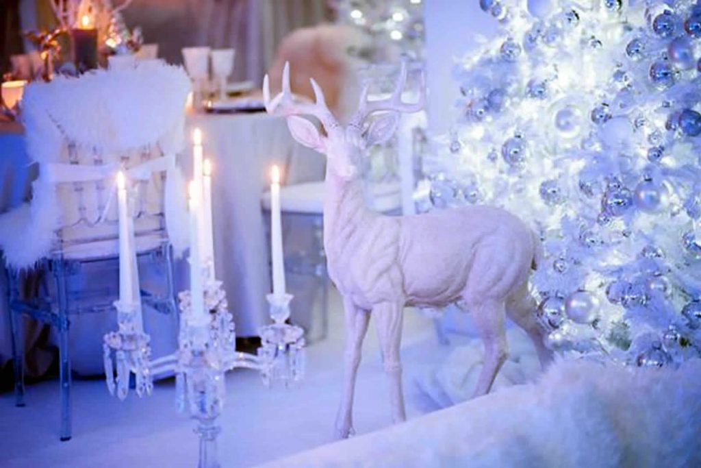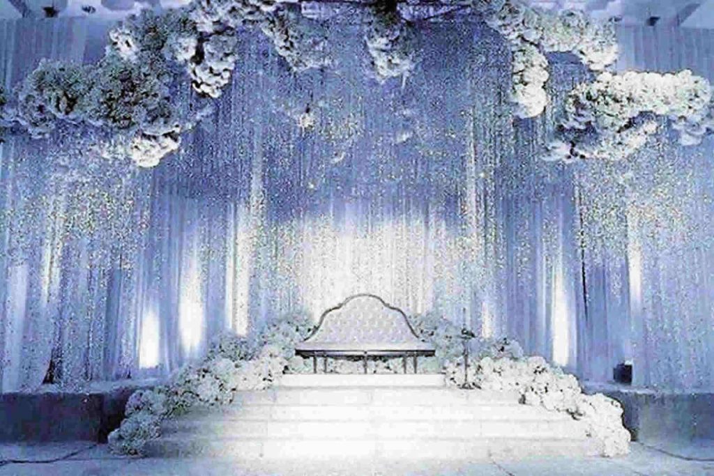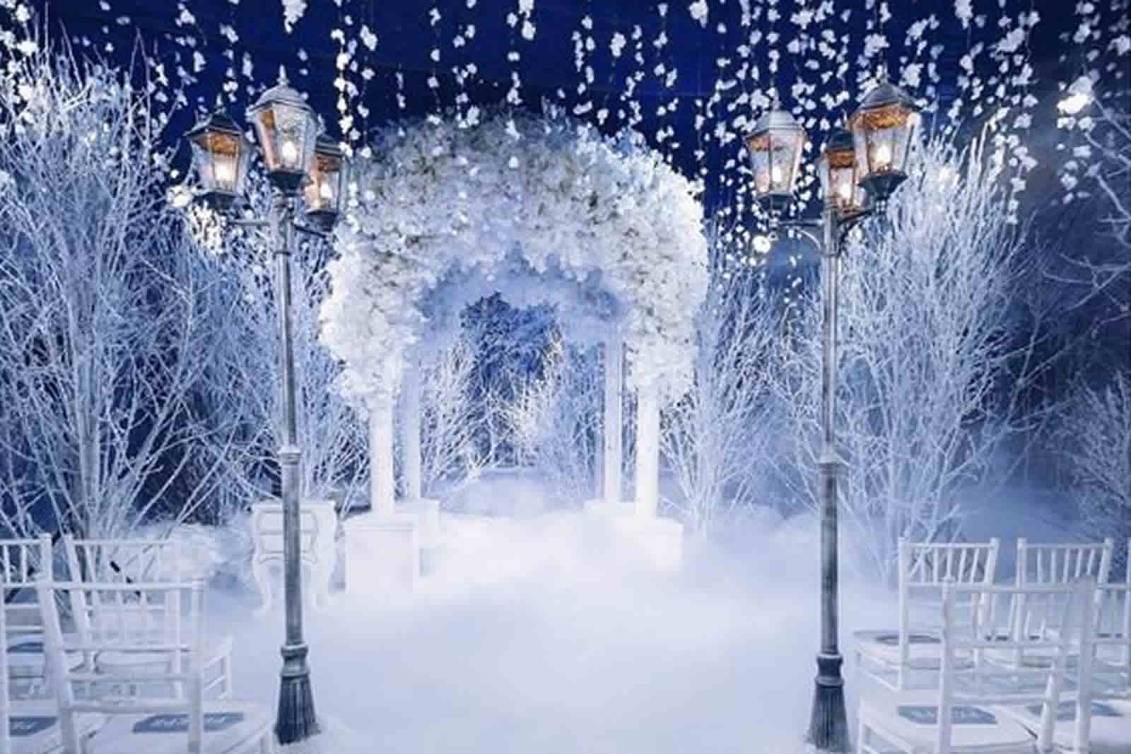 Imagine a setting of low fog with light snowfall, frozen trees and a winter woodland backdrop for the ideal couple stage. And around the stage, exquisite white drapes with fairy lights adorned between trees and of course the classic Victorian lamppost. This could be the perfect sight for your guests to enter this beautiful Reception Evening.