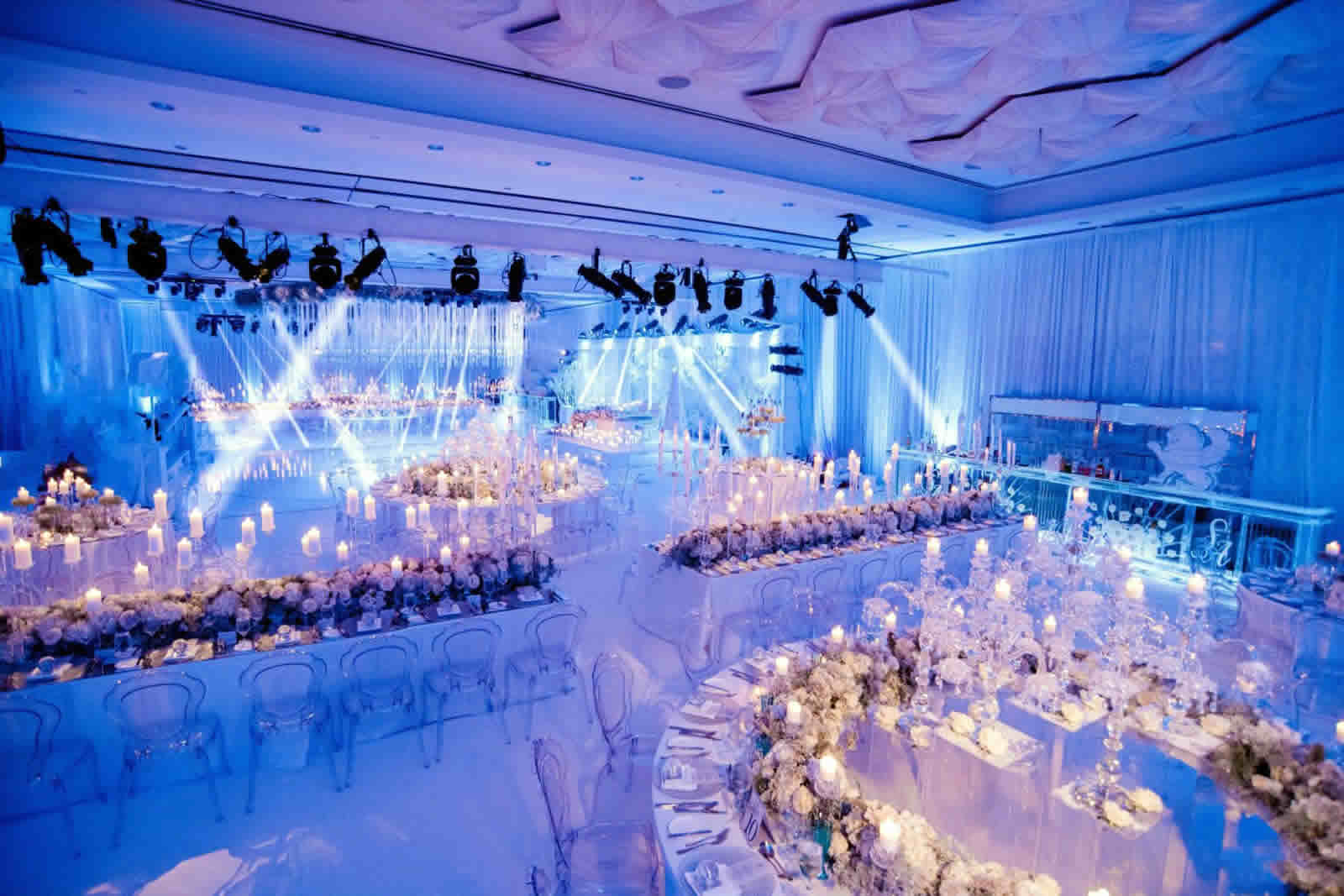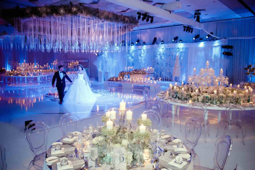 As the evening progresses and you have your first dance on the crystal white dance floor, a chandelier cake descends down and wows your guests with another surprise. Your attendees will enjoy the fun filled evening with surprises and entertainment throughout.